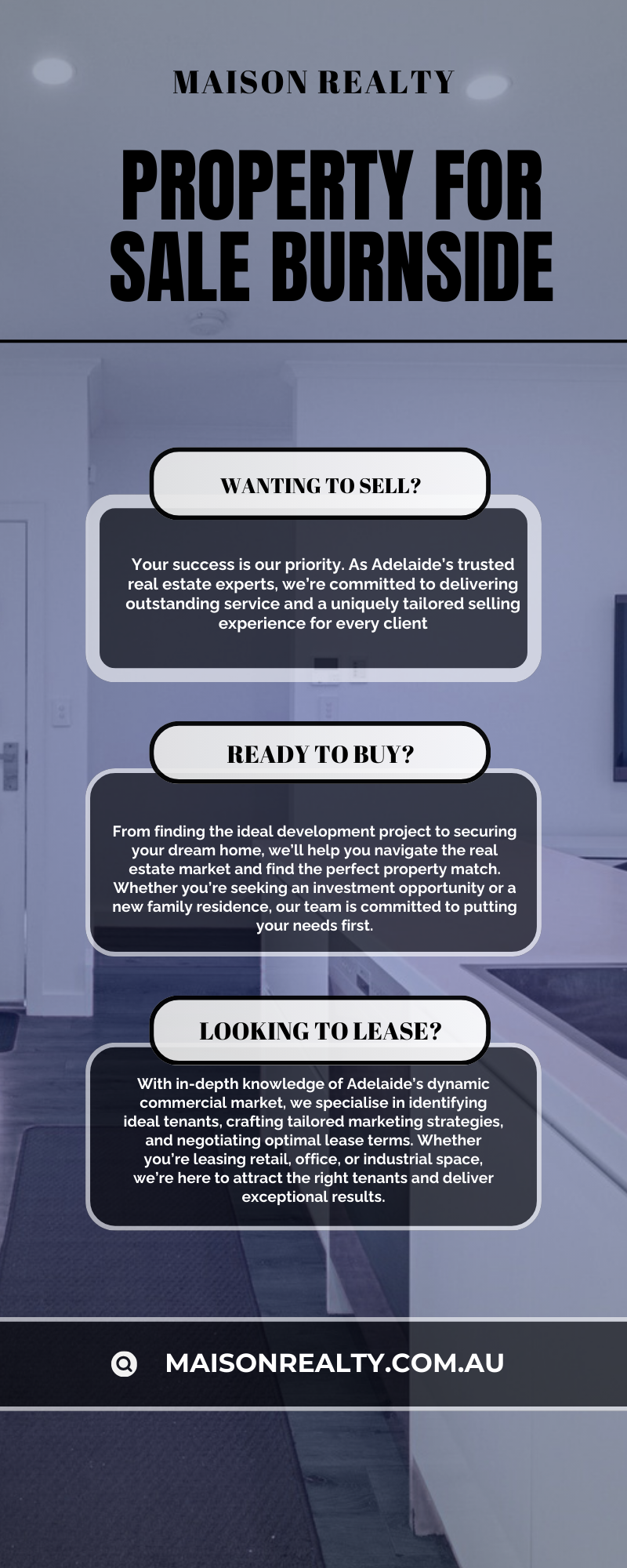 Are you finding it challenging to find the best property for sale Burnside? Don’t waste your time and contact Maison Realty. This well-known suburb provides people with excellent schools, scenic surroundings, and luxury homes. Whether you are planning to invest or buy a perfect house for your family, our property listings have the finest properties. Give us a call today on 0434581775 to explore all the available options. Visit us :