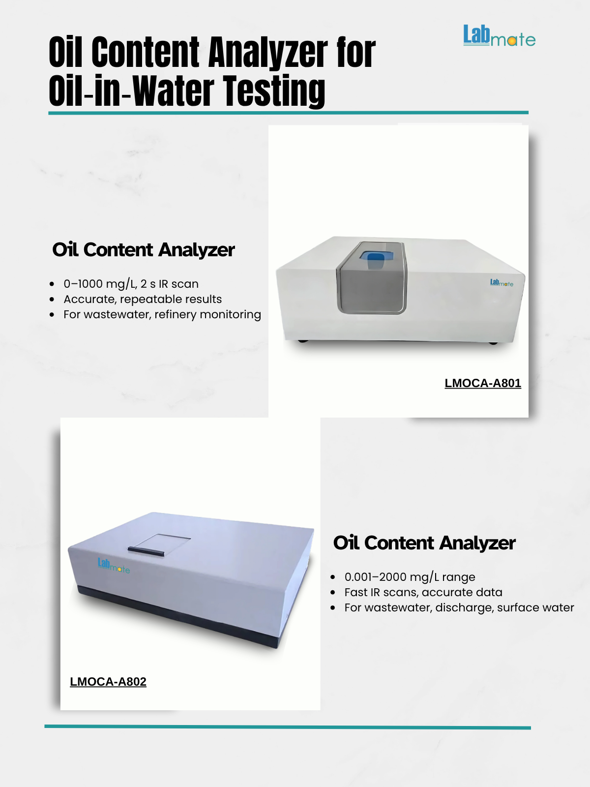 Labmate Oil Content Analyzers measure low-level oil in water across a wide concentration range. They deliver high accuracy and repeatability for consistent monitoring of contamination levels. Suitable for wastewater process water and environmental compliance testing in labs and industrial facilities.