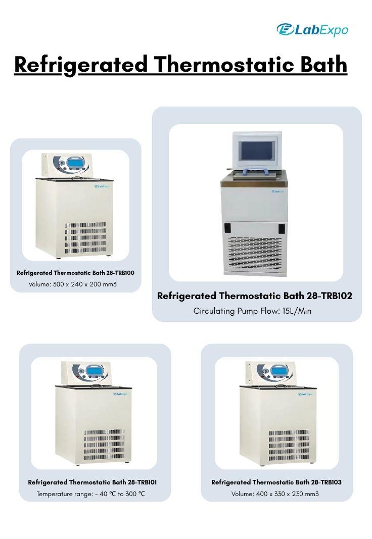 LabExpo Refrigerated Thermostatic Baths provide precise temperature control with integrated cooling and heating. They include digital controls and safety protection for stable operation. Used in laboratories for analytical procedures, research, and testing.