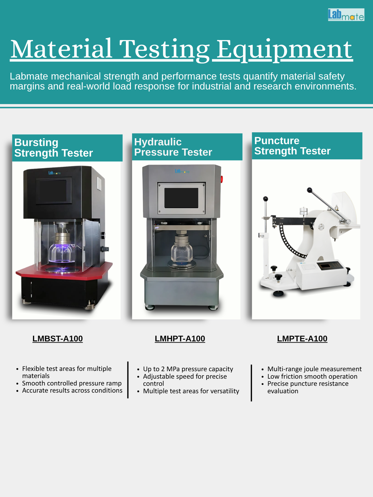 Labmate Material Testing Equipment enables accurate analysis of strength, pressure, and puncture resistance in metals, polymers, packaging, and industrial components. It streamlines QA and R&D workflows. Ensures compliance with ASTM and ISO standards.