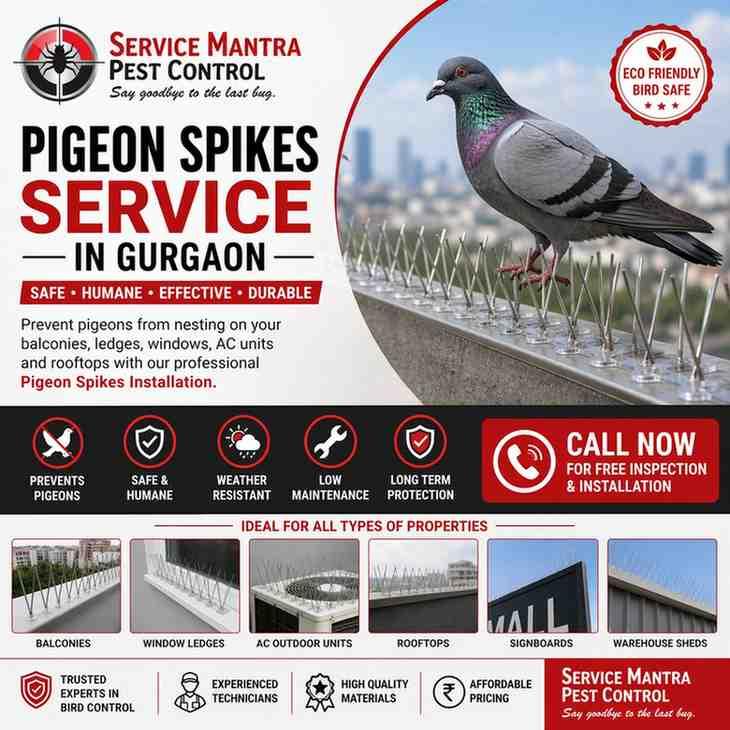 Looking for reliable and affordable pigeon control? Service Mantra offers expert Pigeon Spikes Service in Gurgaon to keep your home and office free from bird nuisance. Our safe and humane spike installation prevents pigeons from nesting on balconies, AC units, windows, and rooftops. Using high-quality, weather-resistant materials, we ensure long-lasting protection and improved hygiene. Choose our professional Pest Control in Gurgaon for effective, eco-friendly, and budget-friendly bird control solutions.